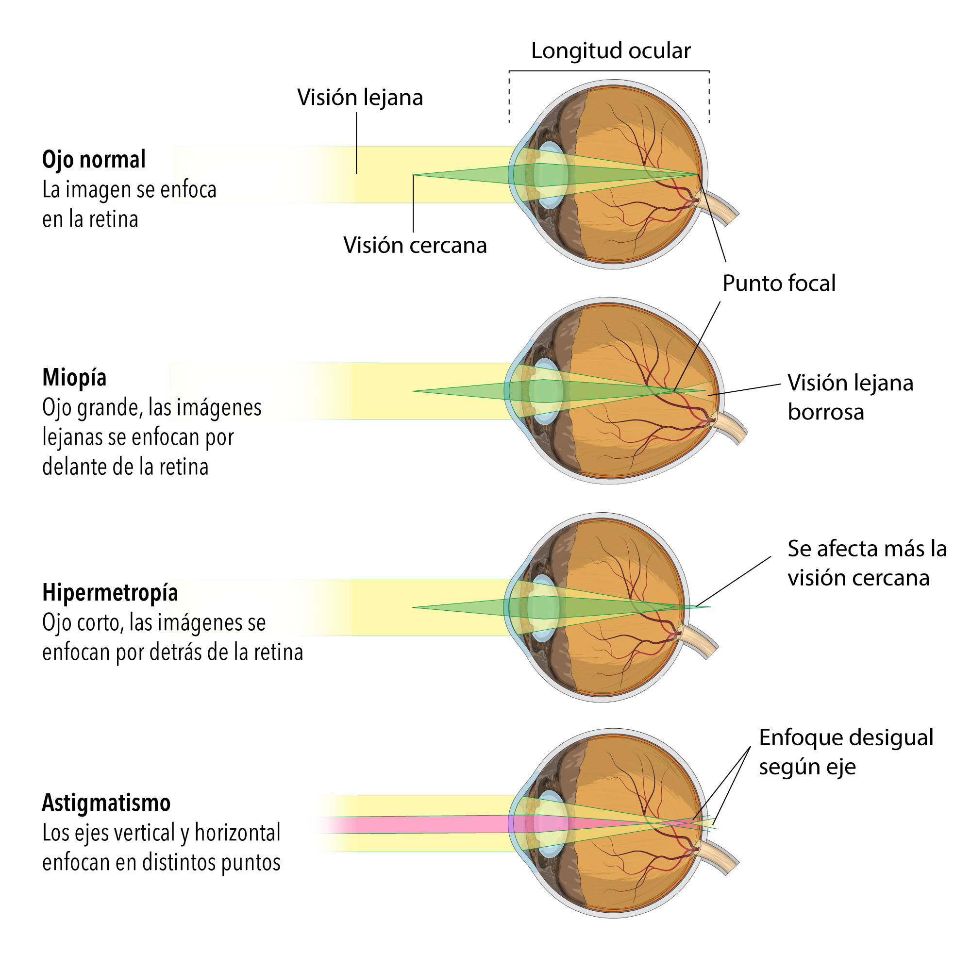 La miopía y el astigmatismo son dos de las ametropías más comunes en la población mundial. La miopía, caracterizada por una visión borrosa a distancia, es cada vez más prevalente, especialmente en entornos urbanos y en países del este asiático. Por otro lado, el astigmatismo, que distorsiona la visión tanto de cerca como de lejos, afecta a una amplia gama de personas sin distinción geográfica.